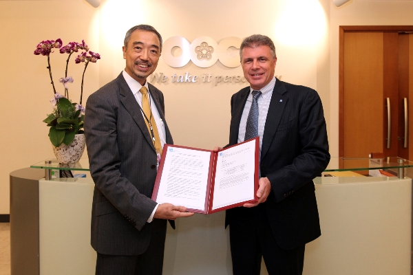 (L-R) Mr. Stephen Ng, Director of Trades of OOCL received the verification certificates from John Rowley, Managing Director, Management Systems & Inspection Services of Lloyd’s Register Group