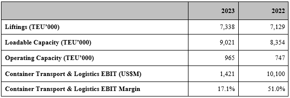 - Container Transport and Logistics business reported EBIT of US$1,421 million, representing an EBIT margin of approximately 17.1%