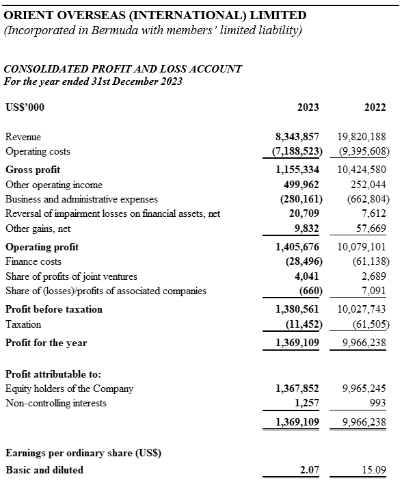 Orient Overseas (International) Limited (“OOIL") today announced a profit attributable to equity holders of US$1,367.9 million for 2023, compared to a profit of US$9,965.2 million in 2022.