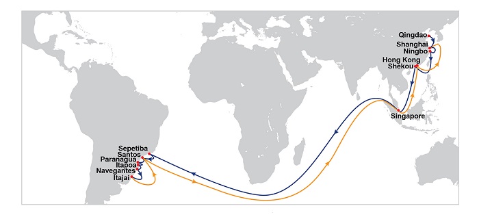 • 拉丁大西洋2 (TLA2): 青岛 – 上海 – 宁波 – 蛇口 – 新加坡 – 塞佩提巴 – 圣多斯 – 巴拉那瓜 – 伊塔波阿 – 纳维根特斯 – 伊塔雅伊 – 圣多斯 – 新加坡 – 香港 – 青岛