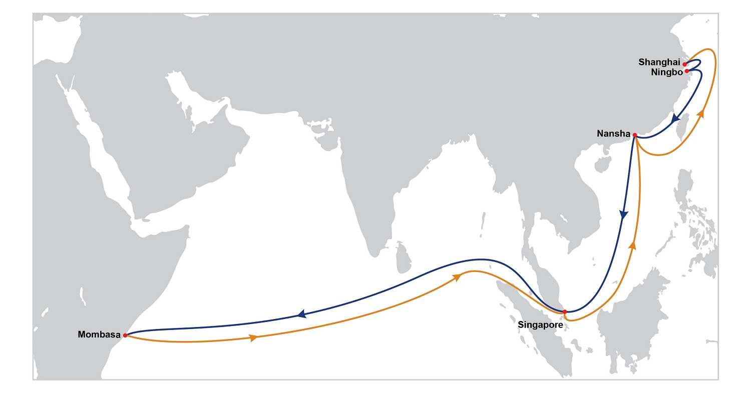 新的EAX1挂靠次序:上海 – 宁波 – 南沙 – 新加坡 – 蒙巴萨 – 新加坡 – 南沙 – 上海