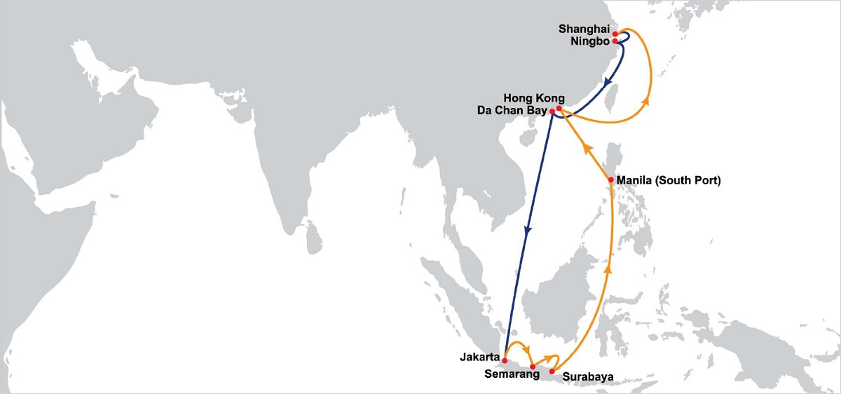 CIP挂靠次序:上海 – 宁波 – 大铲湾 – 雅加达 – 三宝垄 – 泗水 – 马尼拉南港 – 香港 – 上海