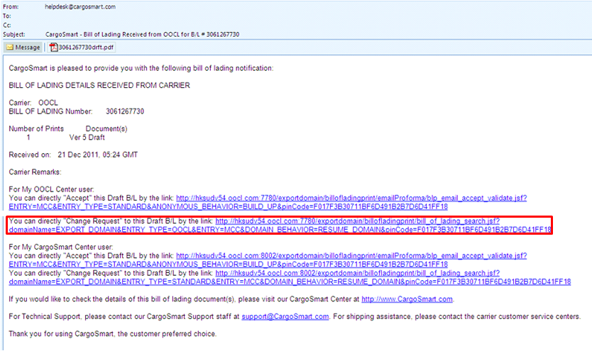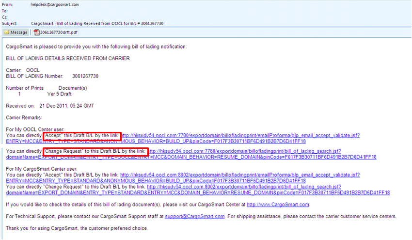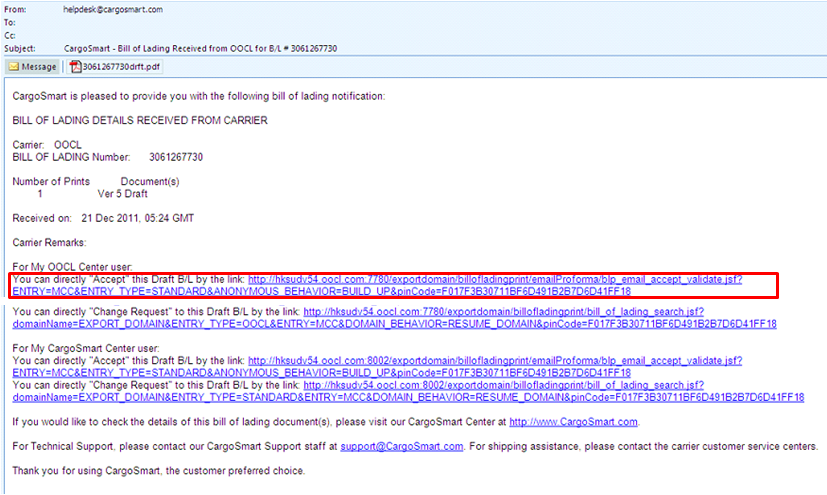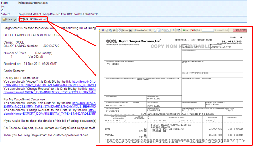 完成”电子邮件定制”后, 一旦我们将您的提单样本上传至”我的OOCL中心”, 您即可收到相关提单确认的电子邮件. (请见图示):
