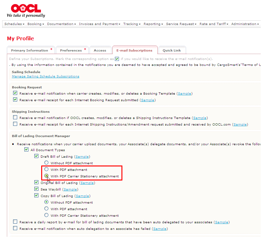 如需享用”一键确认”这一新功能, 您只需登陆”我的OOCL中心” , 通过”用户资料”在”电子邮件定制” 中选择如下服务(请见图示):