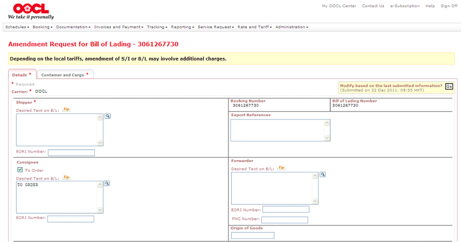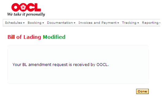 点击”更改” 链接, 表示您还需要对提单样本做部分修改. 此时, 系统会根据您的指示将页面跳转至”我的OOCL中心”的登陆页面.您需要在登陆后, 完成更改提单样本的操作. (请见图示):