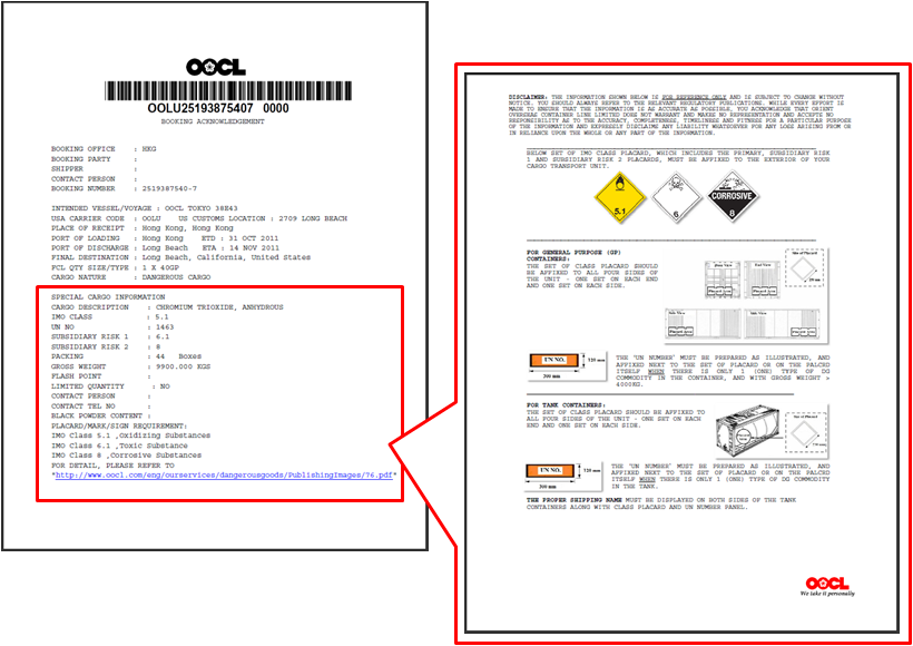 东方海外一直致力于危险品的安全运输, 为了更好的服务于东方海外的危险品客户, 让所有的危险品都能符合国际海事组织的国际海运危险货物规则 (IMDG Code), 我们将在订舱确认(Booking Acknowledgement) 中增加危险品贴标操作说明供客户参考.