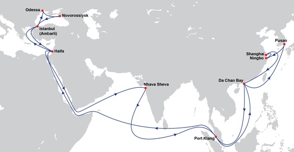 EMX的靠港次序为:釜山 - 宁波- 上海 - 大铲湾- 巴生港 - 经苏伊士运河– 海法 – 伊斯坦堡- 敖德薩 - 諾沃羅西斯克 - 伊斯坦堡 - 海法 - 经苏伊士运河 - 哈瓦舍瓦 - 巴生港 - 大铲湾 - 釜山