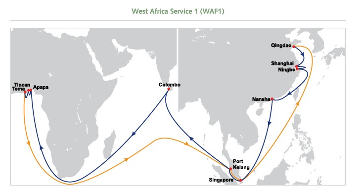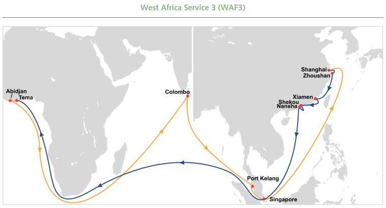 • West Africa Service 3 (WAF3): Shanghai - Zhoushan - Xiamen - Shekou - Nansha - Singapore - Tema - Abidjan - Colombo - Port Kelang - Singapore - Shanghai