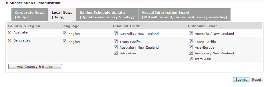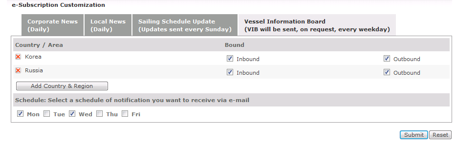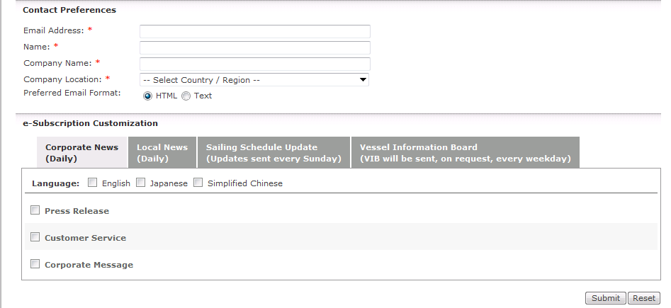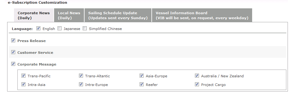 Corporate News: 3 selections are available, namely Press Release, Corporate Messages on OOCL product updates and industry’s new requirements, and Customer Services which covers the latest on our quality service and e-channel new developments. Customers can also choose the language they prefer, while frequency of e-delivery is daily.