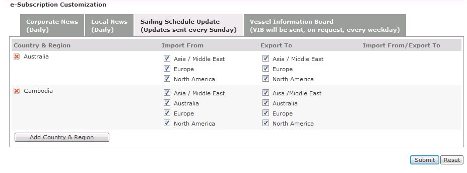 OOCL.com e-Subscription page has a new look! After filling in the contact information and selecting the email format preference, Customers can go through each category in “tab” format to customize the e-subscription: