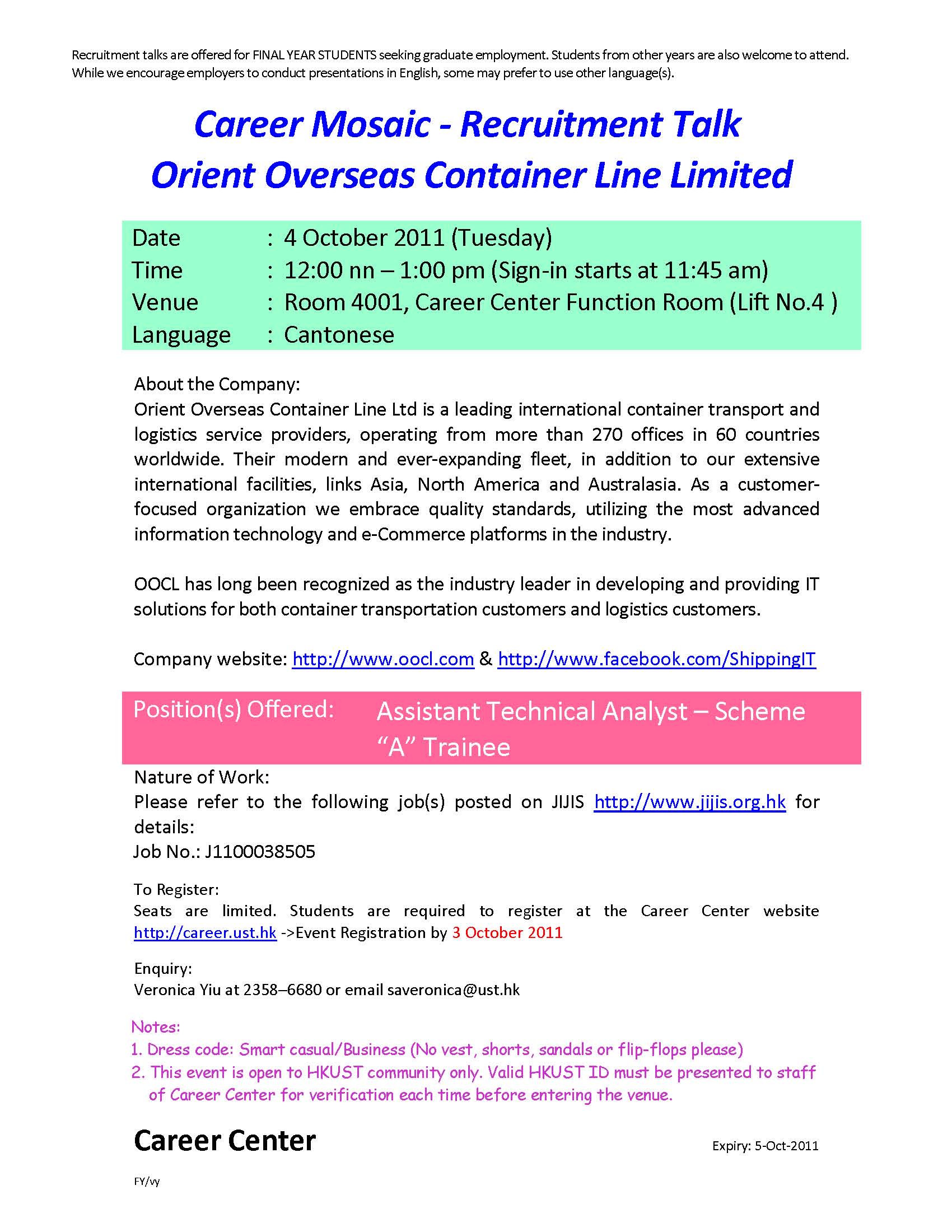 OOCL will participate in the “HKUST Career Mosaic 2011-2012” this Tuesday (October 4), an on-site recruitment and campus interview. An IT recruitment talk will also be arranged 12-1pm in Room 4001, Career Centre Function Room (Lift No 4). You’re highly recommended to invite your friends, schoolmates to join the fair.