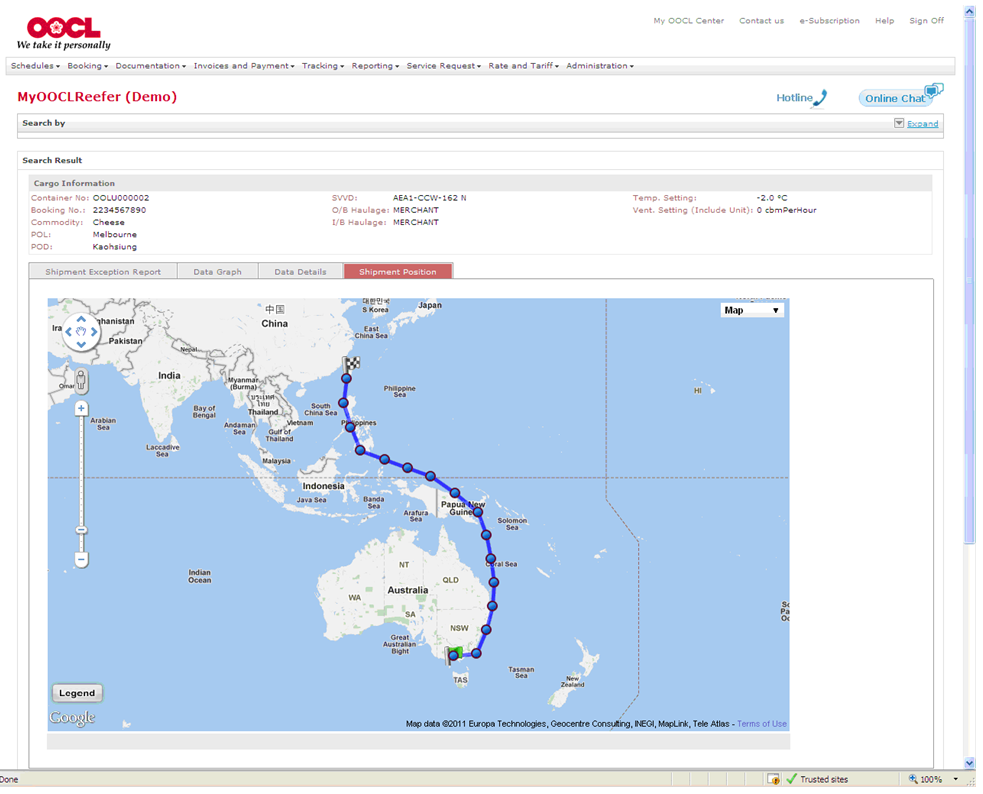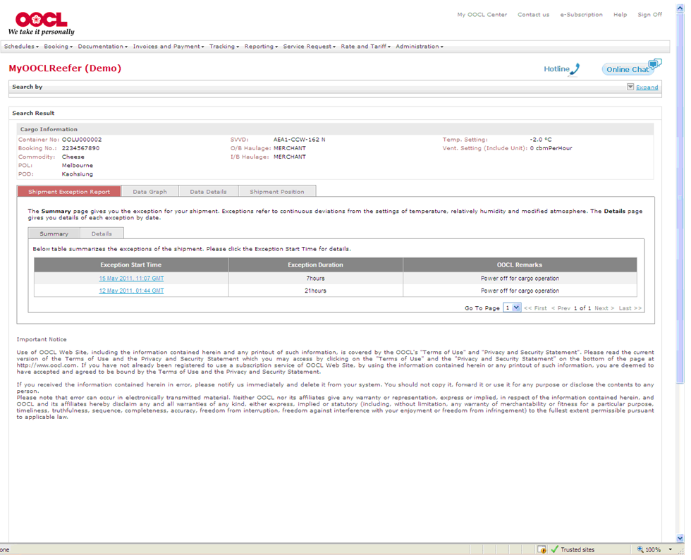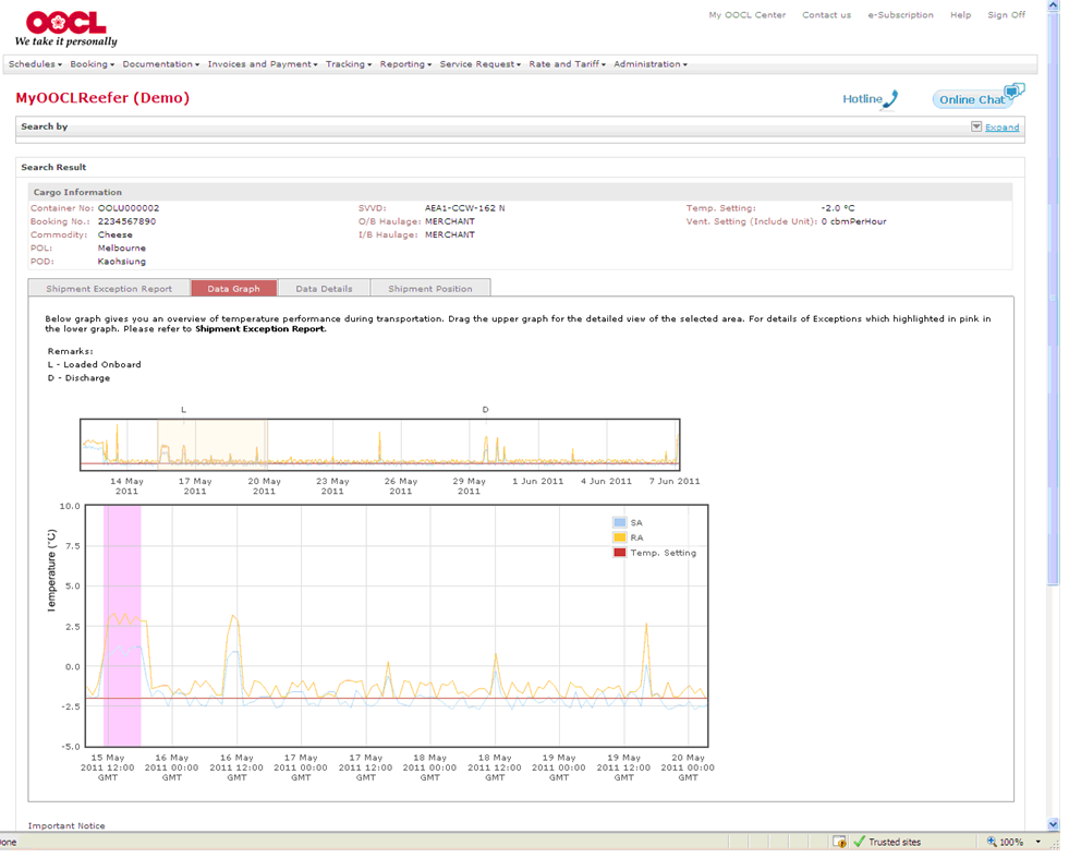 MyOOCLReefer provides useful information to customers and ensures agreed service levels are maintained. Customers subscribing to the MyOOCLReefer service receive a host of benefits, such as access to temperature and relative humidity data, support channel, and briefing on the data displayed in MOC. The service is backed up by a dedicated 24/7 customer support team.