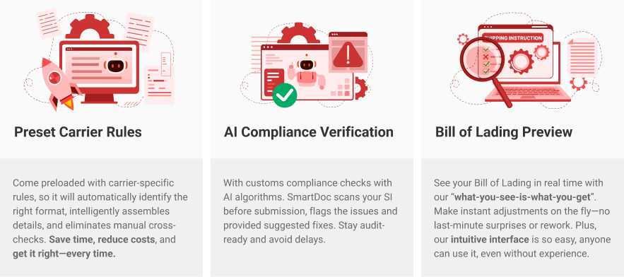 SmartDoc combines decades of shipping expertise with advanced AI technology to deliver smart data validation, real-time customs compliance checks, and a sleek, user-friendly interface. It eliminates repetitive manual tasks, slashes compliance risks, and minimizes errors—helping you boost efficiency, cut costs, and enhance operational performance.