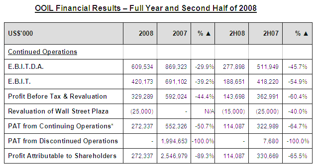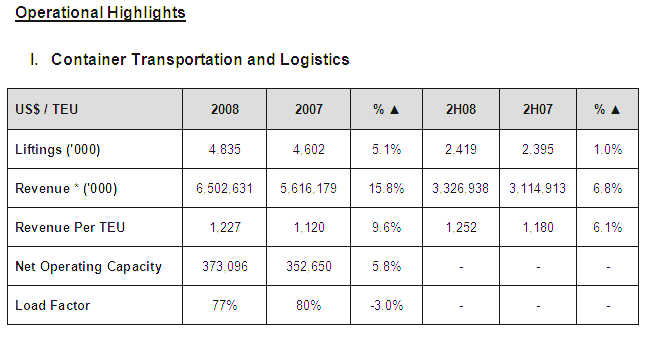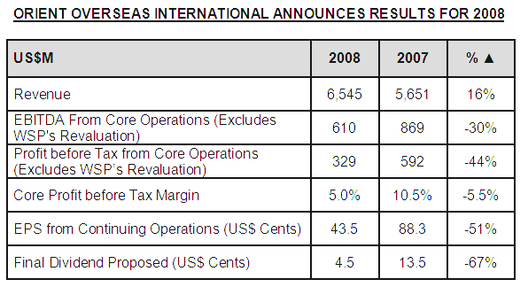 “Despite the increased costs and falling freight rates in 2008, Orient Overseas (International) Limited and its subsidiaries (the “Group”) recorded a profit attributable to shareholders for the year of 2008 of US$272.3 million. As the prior year’s result of US$2,547.0 million included a one-time profit of US$1,994.7 million from the sale of the Terminal Division, the appropriate comparison is of profit from continuing operations. The 2008 Profit from Continuing Operations is US$275.5 million, which is a US$278.2 million (50%) reduction from the equivalent US$553.7 million reported for 2007.”