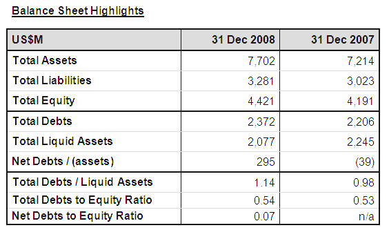 - Liquid Assets exceed US$2.0 billion as at 31st December 2008