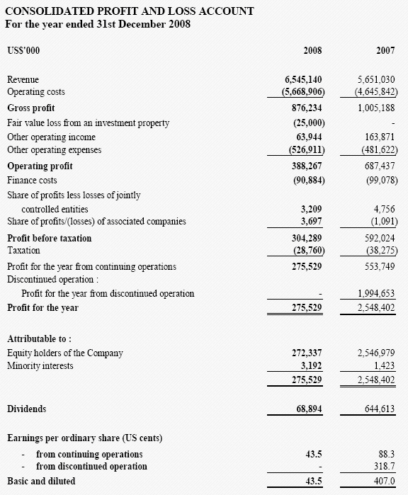 Net profit attributable to shareholders from continuing operations dropped 50% from US$552 million in 2007 to US$272 million in 2008.