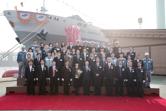 The new vessel was christened the m.v. OOCL Norfolk by sponsor Mrs Renate Kuznik, the wife of Mr Harald Kuznik, Executive Vice President and Global Head of Shipping of HSH Nordbank. Mr. S.Y. Bae, President and Shipyard General Manager of Samsung Heavy Industries, hosted the ceremony at Geoje.
