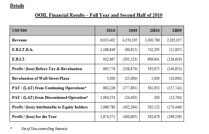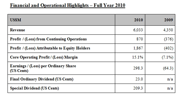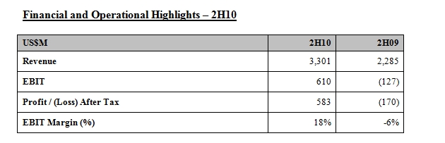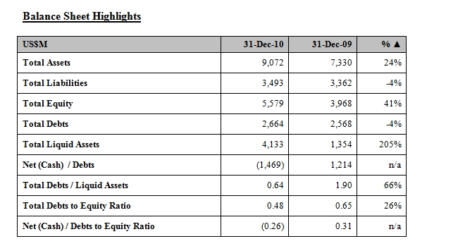 Mr. Kenneth Cambie, the Group Chief Financial Officer, commented, “As at 31st December 2010, the Group had total liquid asset balances of US$4,132.9 million compared with debt obligations of US$247.8 million repayable in 2011. Debt to equity ratio changed from 0.31: 1 at end of 2009 to a net cash position at end of 2010 with the receipt of proceeds from the OODL sale.”