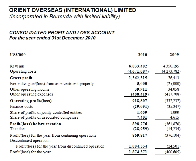 Orient Overseas (International) Limited and its subsidiaries (the “Group”) today announced a profit attributable to shareholders for 2010 of US$1,866.8 million, compared to a loss of US$402.3 million reported for 2009.