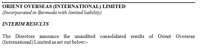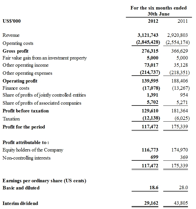 Orient Overseas (International) Limited and its subsidiaries (the “Group”) today announced a profit attributable to equity holders, after tax and non-controlling interest, of US$116.8 million for the six-month period ended 30th June 2012 compared with US$175.0 million for the same period in 2011. The 2012 interim result represents a US$58.2 million or 33% decrease in earnings from comparable activities.