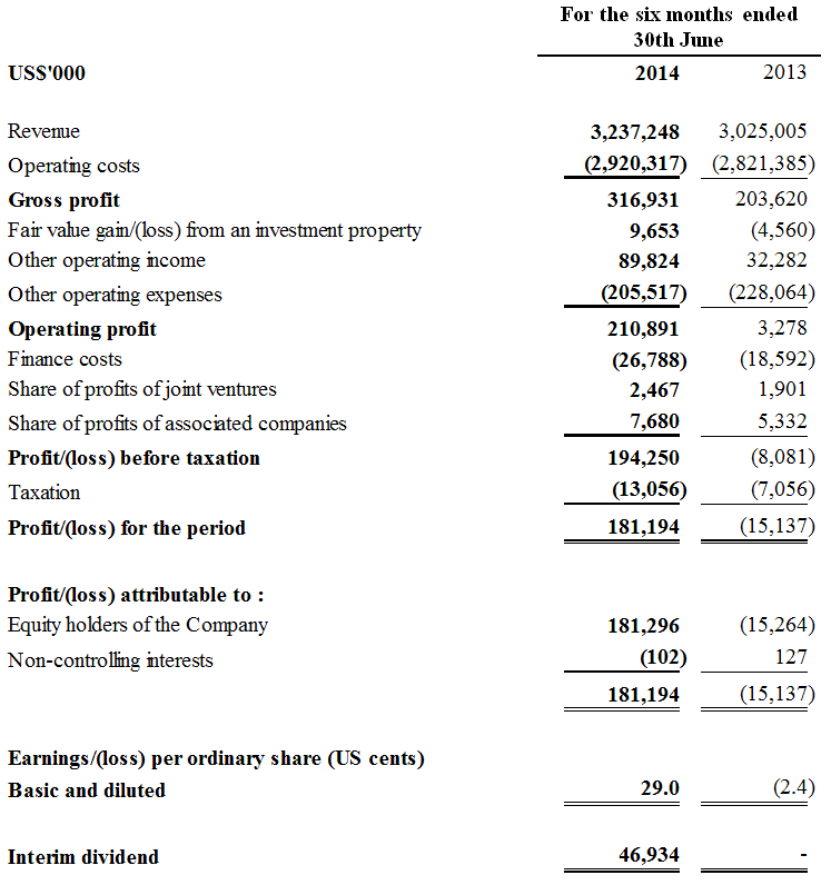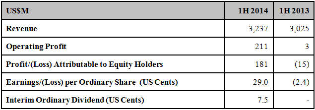 Earnings per ordinary share for the first half of 2014 was US29.0 cents, whereas loss per ordinary share for the first half of 2013 were US2.4 cents.