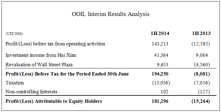 The profit after tax and non-controlling interests attributable to equity holders for the first six months of 2014 included investment income of US$41.4 million from Hui Xian and a net fair value gain of US$9.7 million on Wall Street Plaza revaluation after capital expenditure net off.