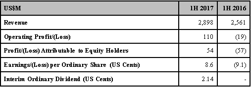 Earnings per ordinary share for the first half of 2017 were US8.6 cents, whereas loss per ordinary share for the first half of 2016 was US9.1 cents.
