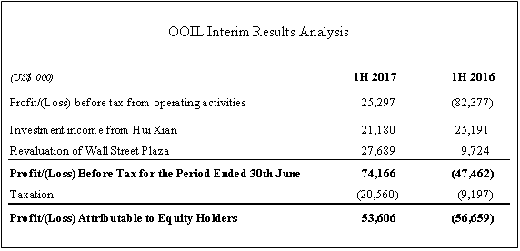 The profit attributable to equity holders for the first six months of 2017 included investment income of US$21.2 million from Hui Xian and a net fair value gain of US$27.7 million on the revaluation of Wall Street Plaza.