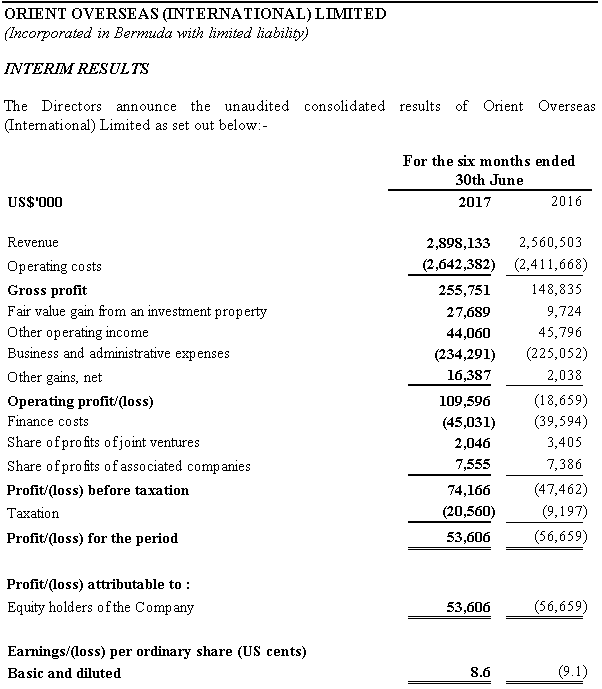Orient Overseas (International) Limited and its subsidiaries (the “Group”) today announced a profit attributable to equity holders of US$53.6 million for the six-month period ended 30th June 2017, compared with loss of US$56.7 million for the same period in 2016.