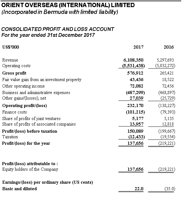 Orient Overseas (International) Limited and its subsidiaries (the “Group”) today announced a profit attributable to equity holders for 2017 of US$137.7 million, compared to a loss of US$219.2 million in 2016.