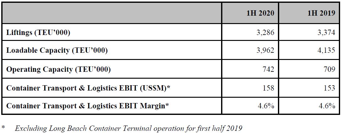Compared to the first half of 2019, OOCL total liner liftings decreased by 2.6%, but revenue per TEU increased by 6.0%, allowing total revenue to increase by 3.2%.  Negative market growth occurred on several trades, but in some cases this drop in liftings was outpaced by an improvement in the freight rates.