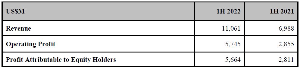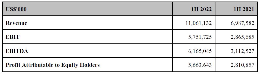 Earnings per ordinary share for the first half of 2022 was US$8.58, whereas earnings per ordinary share for the first half of 2021 was US$4.42.