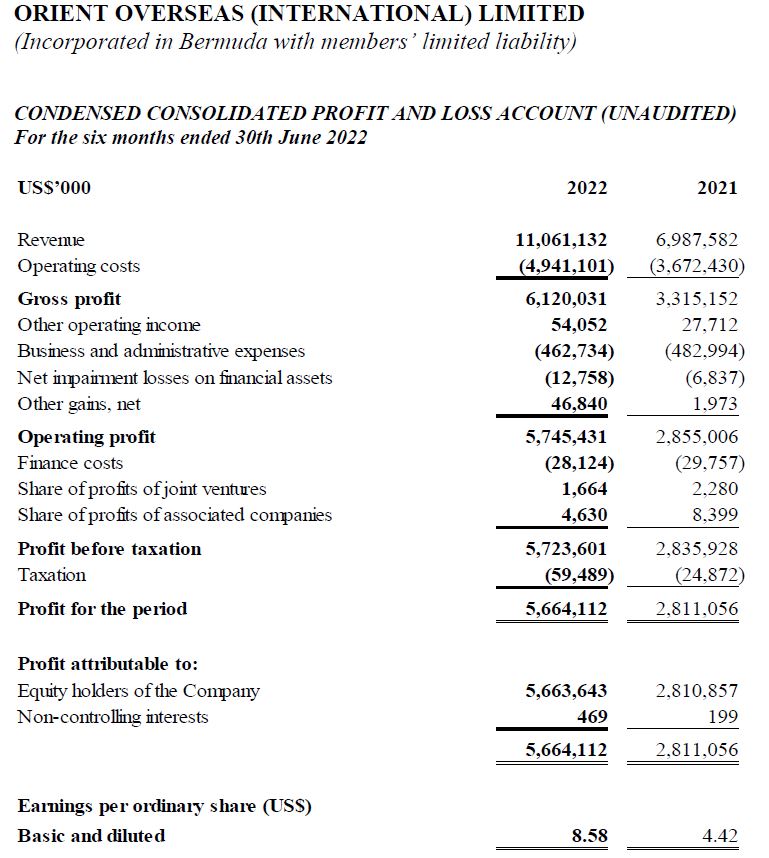 Orient Overseas (International) Limited (“OOIL”) today announced a profit attributable to equity holders of US$5,663.6 million for the six-month period ended 30th June 2022, compared to a profit of US$2,810.9 million for the same period in 2021.