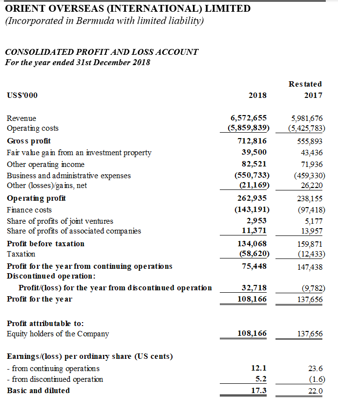 Orient Overseas (International) Limited and its subsidiaries (the “Group”) today announced a profit attributable to equity holders for 2018 of US$108.2 million, compared to a profit of US$137.7 million in 2017.