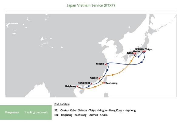 东方海外现时的KTX服务组合共提供六条服务航线连系日本至东南亚市场。 新加入的KTX7航线 将策略性地加靠日本的清水以延伸其市场的覆盖范围。加上最近推出的JCV 服务, 东方海外將提供两条由海防至日本及厦门至日本, 航运周期具竞争力的直航服务,有助提升现时在两地所服务市场的整体连系。