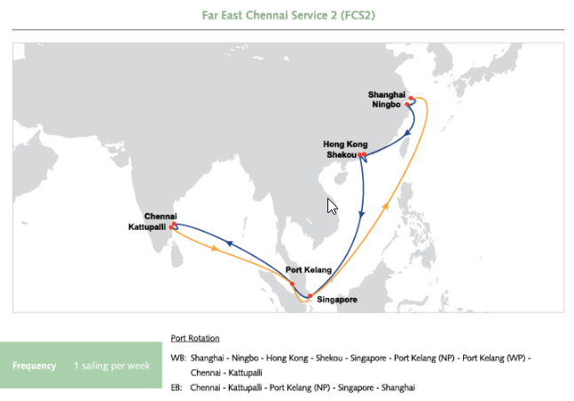 上海 – 宁波 –香港 – 蛇口 – 新加坡 – 巴生港 ( 西港及北港 ) – 金奈– Kattupalli - 巴生港 ( 北港 ) – 新加坡 – 上海