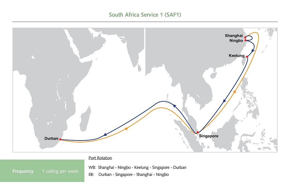 - 南非1 (SAF1): 上海 – 宁波 – 基隆 – 新加坡 – 德班 – 新加坡 – 上海