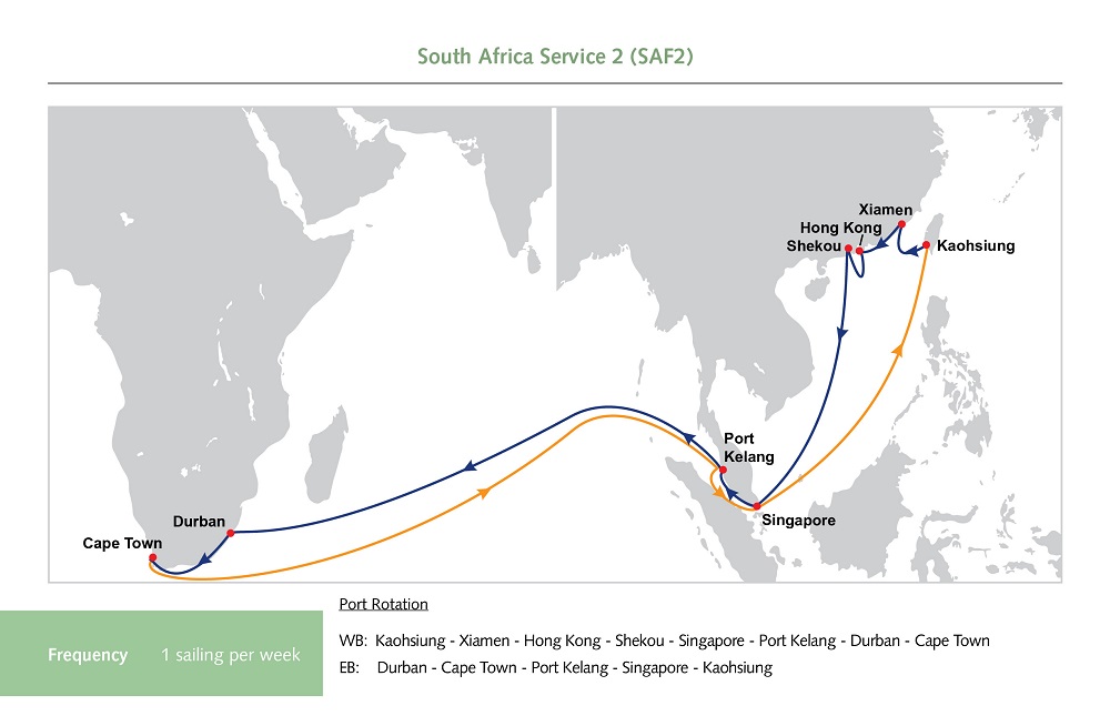 - 南非2 (SAF2): 高雄 – 厦门 – 香港 – 蛇口 – 新加坡 – 巴生港 – 德班 – 开普敦 – 巴生港 – 新加坡 – 高雄