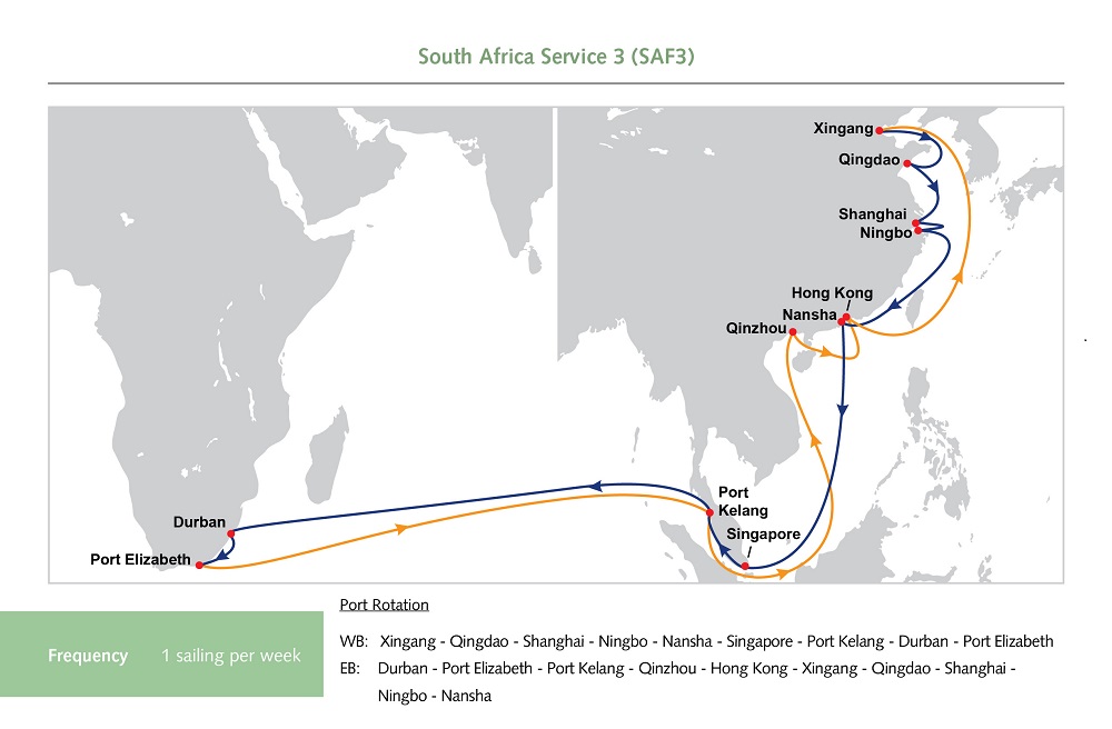- 南非3 (SAF3): 新港 – 青岛 – 上海 – 宁波 – 南沙 – 新加坡 – 巴生港 – 德班 – 伊丽莎白港 – 巴生港 – 钦州 – 香港 – 新港