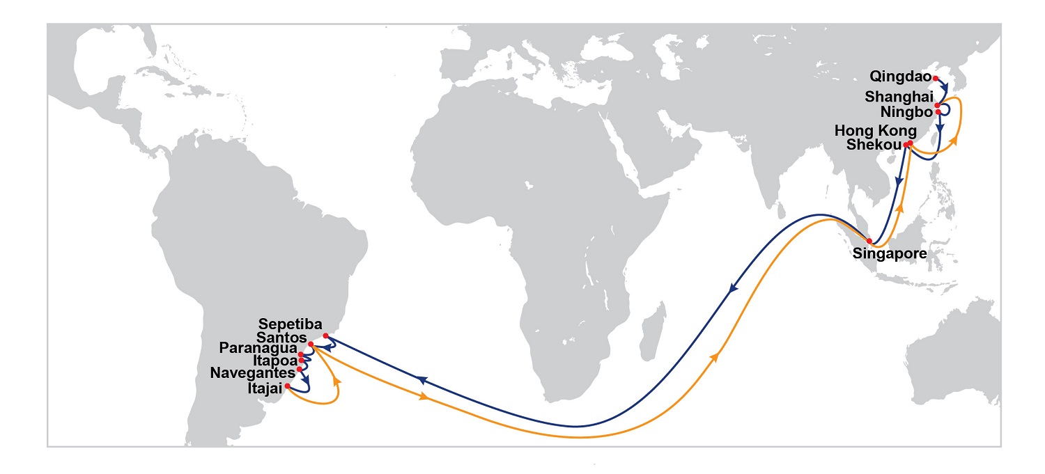 • 拉丁大西洋2 (TLA2): 青岛 – 上海 – 宁波 – 蛇口 – 新加坡 – 塞佩提巴 – 圣多斯 – 巴拉那瓜 – 伊塔波阿 – 纳维根特斯 – 伊塔雅伊 – 圣多斯 – 新加坡 – 香港 – 青岛