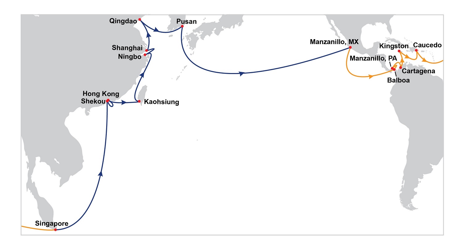 • 拉丁加勒比1 (TLC1): 新加坡 – 蛇口 – 香港 – 高雄 – 宁波 – 上海 – 青岛 – 釜山 – 曼萨尼约, MX – 巴尔博亚 – 曼萨尼约, PA – 塔赫纳 – 金斯敦 – 考塞多 – 新加坡