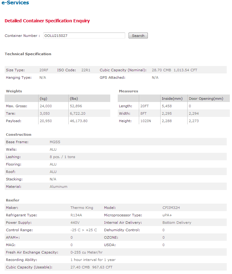 东方海外的客户可以随时随地通过这一新的在线自助服务,获取某一特定集装箱的规格明细(信息列表如下). 从而更好地管理及安排装箱事宜,提高集装箱的使用率.