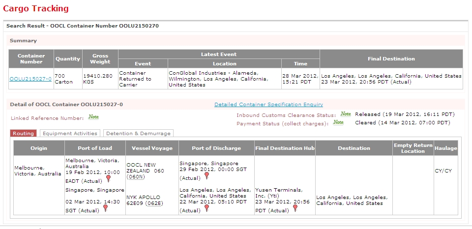 "我的OOCL中心"用户, 可通过使用"货物追踪"功能并点击"集装箱规格明细查询"链接,便能立即获取相关查询结果.