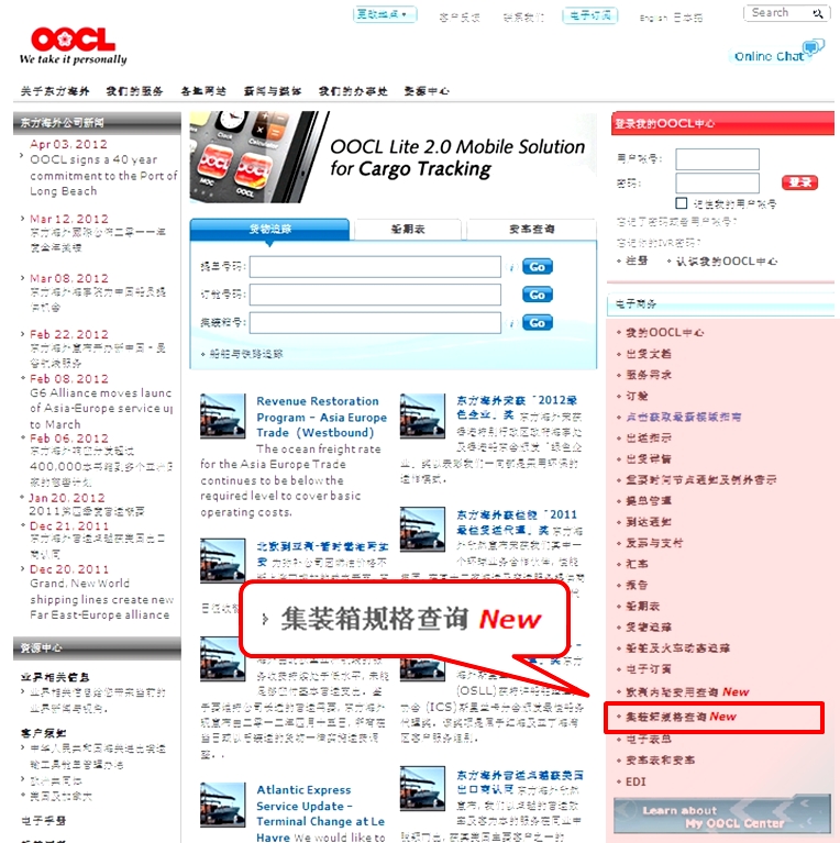 东方海外推出了集装箱规格明细在线查询的新功能. 这新一功能从范围上涵盖了35万个东方海外自有箱及15万个租用箱的查询,从内容上涵盖了干货箱的内部尺寸和建构组成及冷藏箱可装载的实际容积和制冷剂类型的查询.