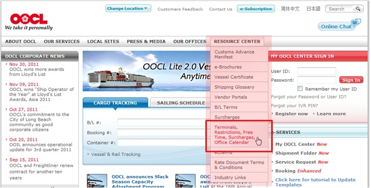 您可通过登陆东方海外官方网站,选择 我们的服务“菜单,点击”电子商务”版块进行查询. 亦或直接从东方海外主页的“电子商务”版块中选择“欧洲内陆费用查询” 进入查询.