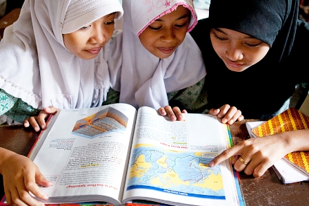 Students at a community learning center in Jakarta, Indonesia pore over a brand-new textbook provided by Books for Asia. Photo by Anne Luntungan