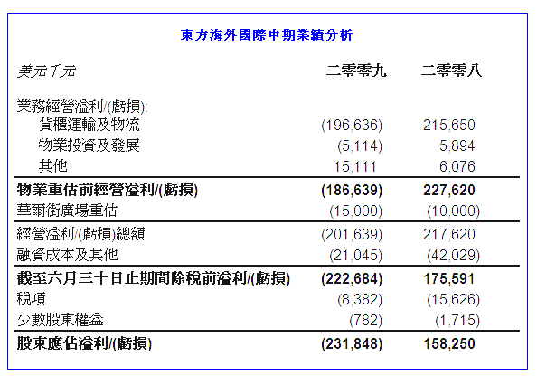 未計算「華爾街廣場」重估減值一千五百萬美元之經營虧損較二零零八年上半年逆轉四億一千四百二十萬美元。經營虧損乃由於貨櫃運輸及物流業務經營環境惡劣所致。