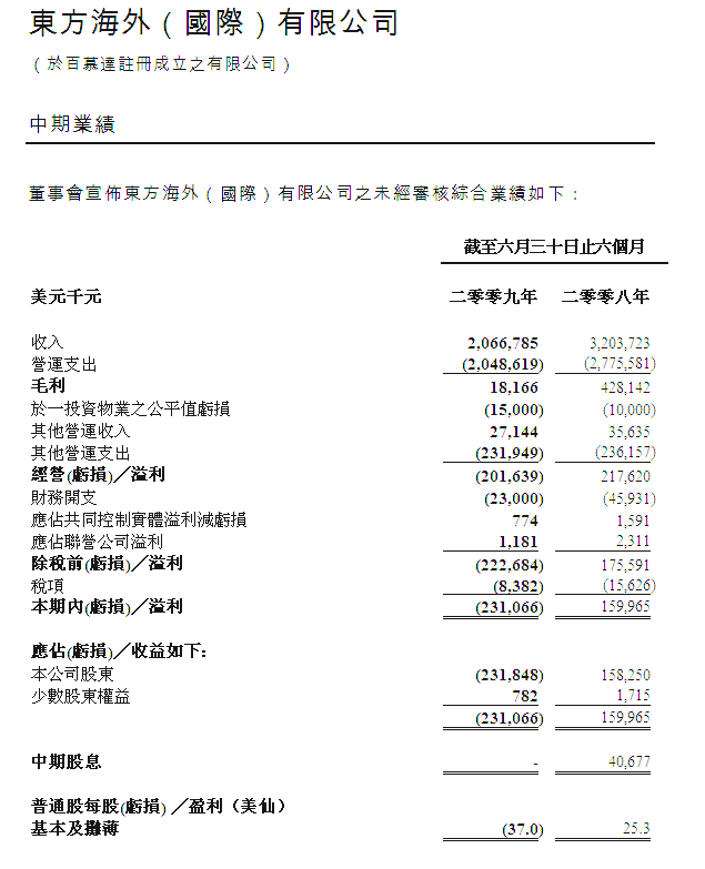 東方海外(國際)有限公司(「東方海外國際」)集團今天公佈二零零九年首六個月錄得核心業務經營虧損一億八千六百六十萬美元。