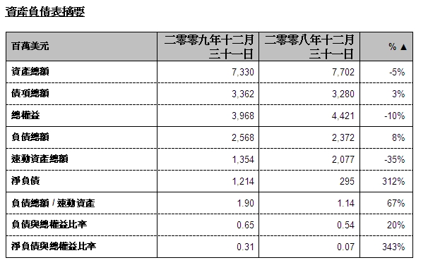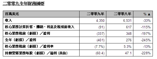 · 二零零九年全年虧損四億零一百萬美元,比對二零零八年為溢利二億七千六百萬美元