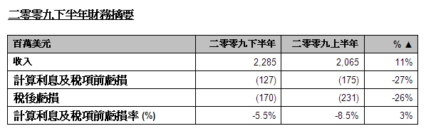 · 下半年計算利息及稅項前虧損自上半年之一億七千五百萬美元降至一億二千七百萬美元,減少四千八百萬美元或27%
